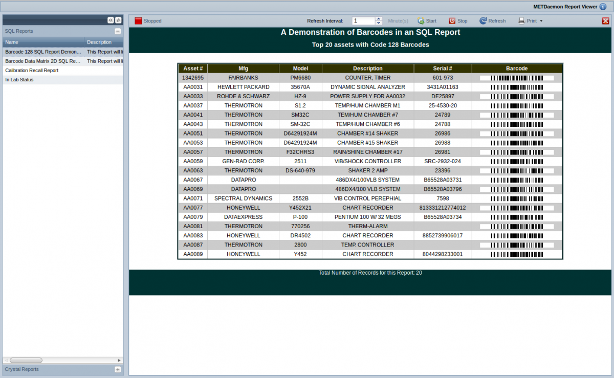 METDaemon Report Viewer is an integrated program within the METDaemon Application Server that not only utilizes the existing reports created for other applications, but it also enforces the security roles for reports that are configurable in the METDaemon Application Server. For example, you could have separate report groups which will allow different groups of users to view the reports . A great application for the MRV would be the use of a large central display that can be easily viewed in a room. For example, a calibration lab could set up a continuous display with instruments awaiting calibration, instruments completed calibration, or both. The refresh rate is configurable from 1 to 60 minutes.